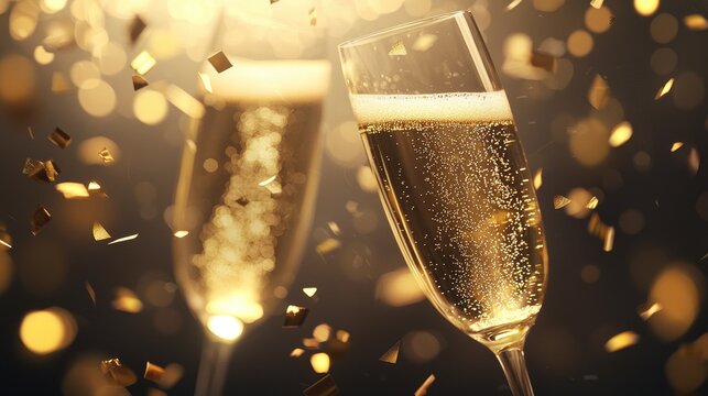 Celebrate with two elegant champagne flutes sparkling against a festive background, perfect for New Year or special occasions.