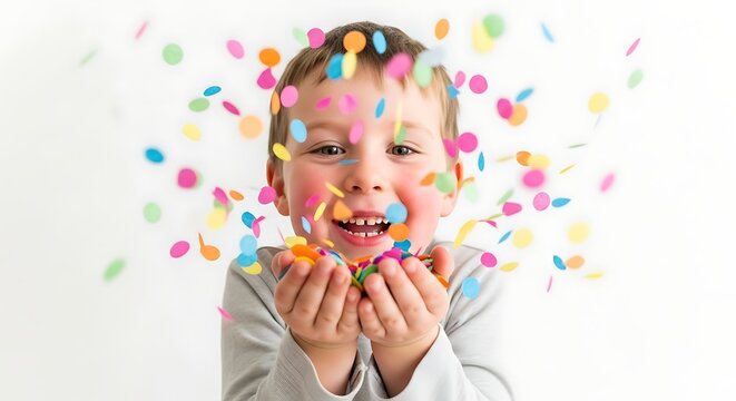 Child's Play of Color: A joyous child is enveloped by a cascade of colorful confetti. a moment of pure bliss and unadulterated delight.