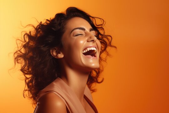 A woman is captured in a moment of joy as her hair blows in the wind. This image can be used to depict happiness, freedom, or carefree attitude