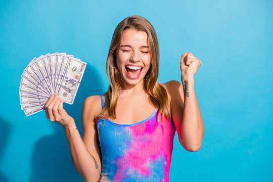 Excited woman celebrating success holding dollar bills against a vibrant blue background in a joyous and triumphant gesture