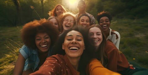 Joyful group of five young friends smiling brightly while posing together for a fun photo, showcasing their happiness and connection in a lively gathering filled with laughter and excitement