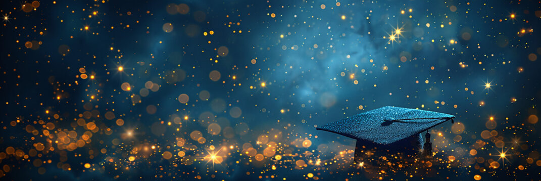 isolated black graduation cap banner, with golden confetti, university graduate celebration, blue background