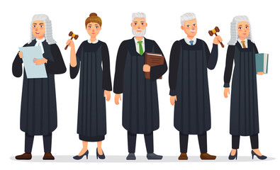 Judges team. Law judge in black robe costume, court people and justice workers vector cartoon illustration. Man and woman holding book and gavel or hummer, law occupation. Magistrate with mallet
