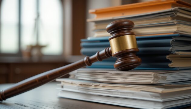 A wooden judge's gavel resting on a stack of legal books