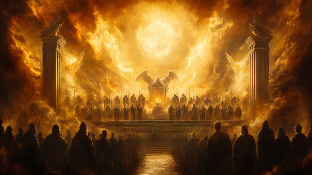 Celestial court convened, with saints and sinners alike facing the divine tribunal of justice, judgment day, doomsday, god is judging,. Omniscient. Illustration
