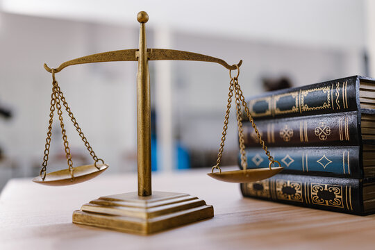 Golden balance scales symbolizing justice on desk at a law office, Law and justice concept.