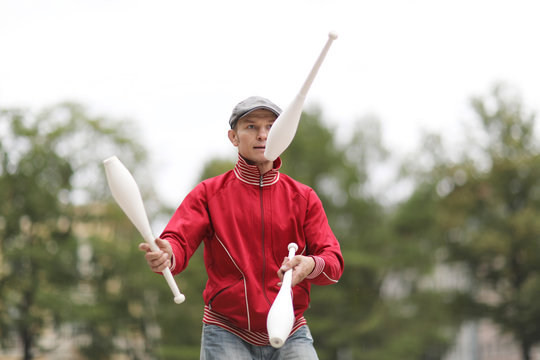 Male juggler with clubs in park