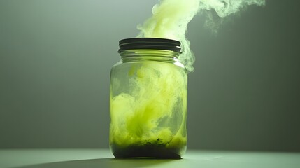 A jar filled with glowing, toxic liquid, emitting a faint green smoke, displayed on a white backdrop