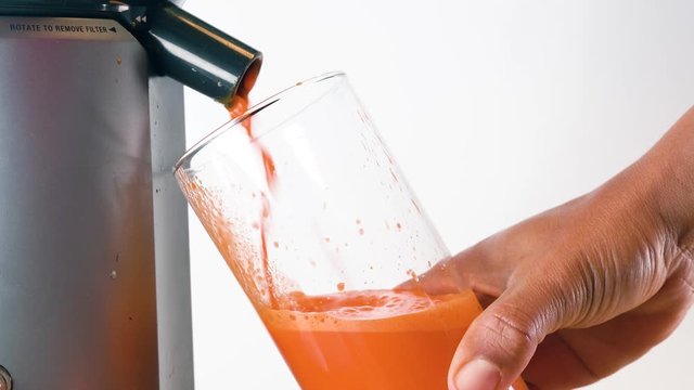 A woman pours fresh carrot juice into glass. Freshly squeezed carrot juice
