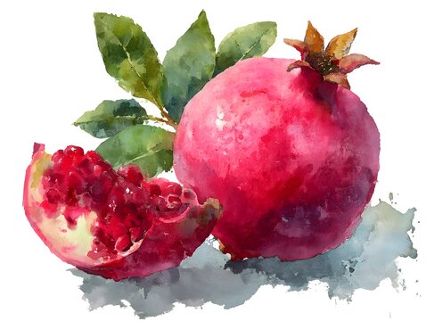 A vibrant watercolor painting features a whole pomegranate and a cut slice showing the juicy seeds inside.