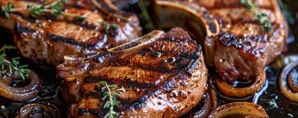Thick, juicy grilled pork chops with deep char lines, floating with a drizzle of apple cider glaze, surrounded by caramelized onions and fresh thyme sprigs.