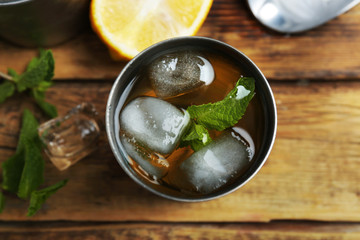 Two cocktails Mint Julep on a bar counter. Horizontal shot
