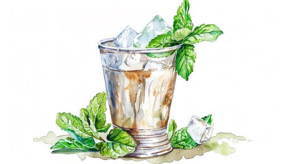 Mint julep glass with a mint sprig,Clipart, watercolor illustration, Perfect for nursery art The style is hand  drawn, white background