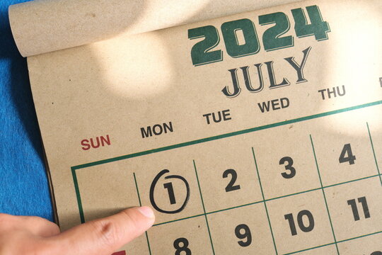 Hand pointing on July 1 2024 date on calendar flat lay in blue background. Canada day celebration reminder.