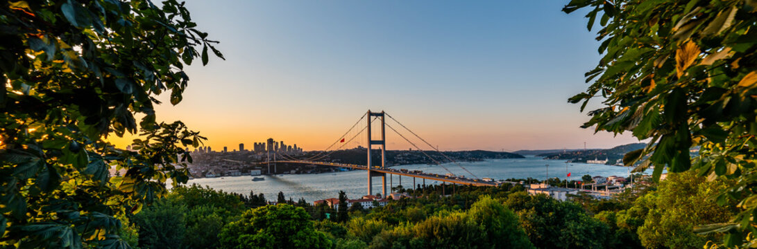 Awesome Panoramic view of Istanbul Bosphorus on sunset. Istanbul Bosphorus Bridge (15 July Martyrs Bridge. Turkish: 15 Temmuz Sehitler Koprusu). Beautiful landscape Turkey.