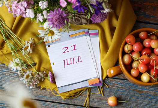Calendar for July 21: flip calendar with numbers 21, month name July in English on a yellow napkin with wild flowers and ripe cherries