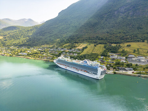 Olden, Norway - 21 July 2025: Aerial view of a colossal cruise ship nestled against the quaint village, reflecting in the fjord's turquoise waters beneath verdant mountains.