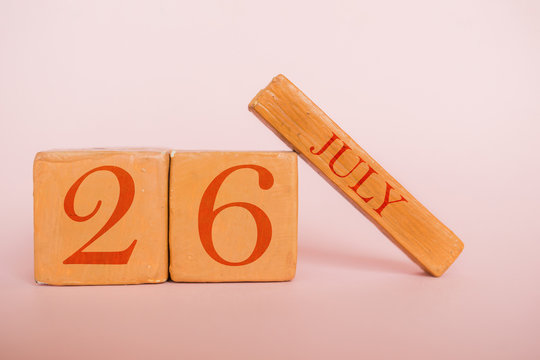 july 26th. Day 26 of month, handmade wood calendar  on modern color background. summer month, day of the year concept