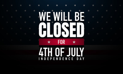 Independence Day, we will be closed for the 4th of July. Suitable for greeting card, poster and banner. Vector illustration.