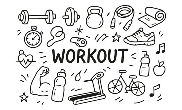 Hand-drawn workout gear and fitness equipment outlined in black and white