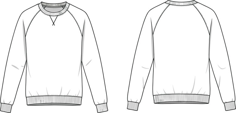 Raglan sleeve sweatshirt crewneck jumper technical flat sketch with front and back views, cad drawing flat vector illustration for apparel design mockup.