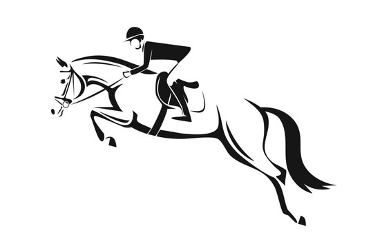 Equestrian rider jumping over an obstacle on a horse, depicted in a minimalist black and white silhouette style