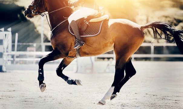 Bottom view on the horse jumping over obstacles with the rider on the horseback