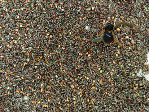 Anapa, Russia - June 11, 2021: Stony beach of Black Sea coast in Bolshoy Utrish village full of people on bright sunny summer day. Aerial view.