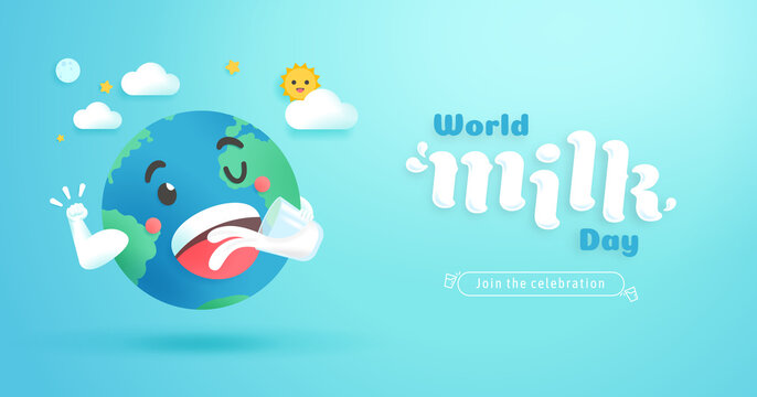 World milk day vector illustration.World smiling and cheerful cartoon drinking a glass of milk and show strength arm healthy to join the celebration with friends sun,moon,cloud.