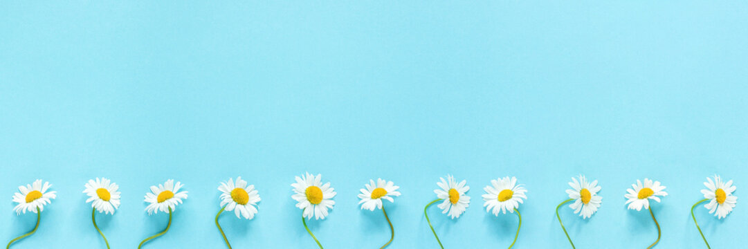 Banner made from row of white chamomiles daisies flowers on pastel blue color paper background. Copy space Template for text or your design Flat lay Top view Concept Hello summer