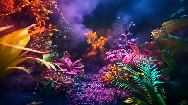 A nighttime scene with lush green and purple tropical plants illuminated by vibrant neon lights, creating a surreal and colorful jungle atmosphere. The glowing colors convey a lively and otherworldly