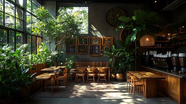 A cozy coffee shop interior with an urban jungle aesthetic, featuring greenery everywhere, large potted trees, and rustic wooden furniture. Soft natural lighting fills the space,