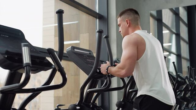 Side view of gym junkie on elliptical trainer gripping handles and staring at console, muscles engaged during intense cardio session in bright urban fitness studio with glass windows and equipment
