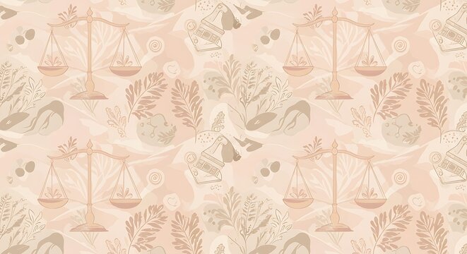 Seamless pattern of scales of justice with floral elements for legal and law themed designs or backgrounds