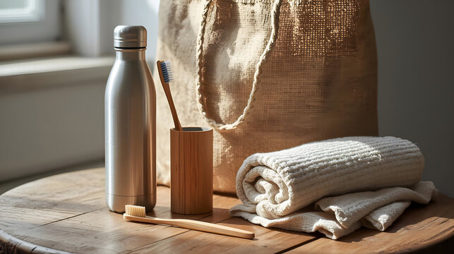 Sustainable zero waste lifestyle essentials with bamboo toothbrushes, a reusable water bottle, and a natural fiber bag on a wooden table