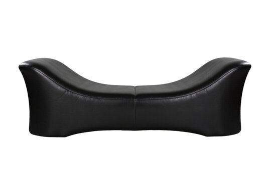 modern and sensual black leather "tantra" bench featuring a unique, ergonomic curved design for yoga or couples' relaxation. This sleek and minimalist piece of furniture is isolated
