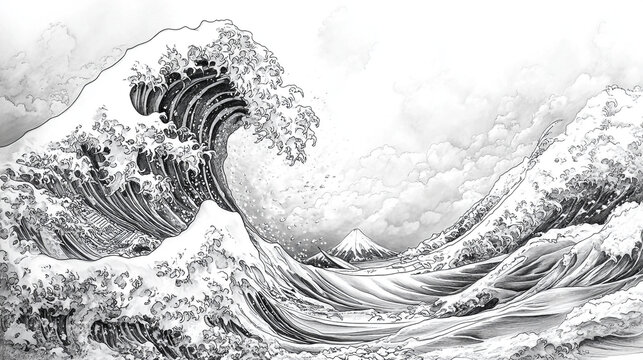 Iconic black and white illustration of Hokusai's The Great Wave off Kanagawa, featuring detailed wave design with moon background