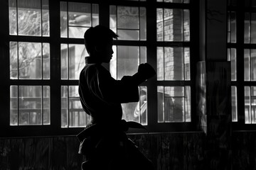 Karate practitioner training at sunset in an abandoned dojo with large windows