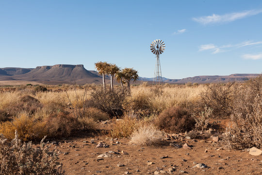 South African landscape with windpump and flat topped Karoo hills. Hot and sunny.