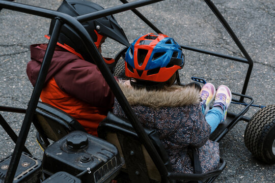 Brother and sister riding in a go kart together