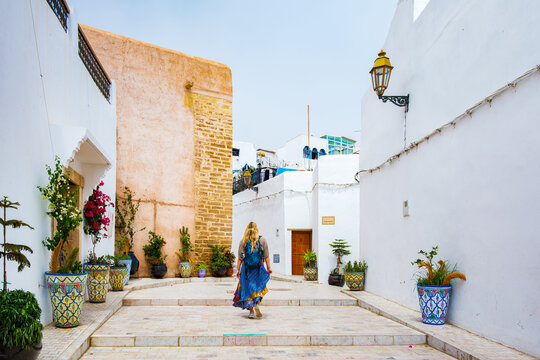 Occidental blonde girl in Kasbah of Udayas fortress in Rabat Morocco. Kasbah Udayas is ancient attraction of Rabat Morocco, near Bou Regreg river.