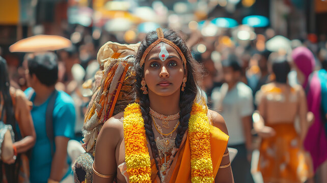 Thaipusam in India, a Hindu devotee in traditional clothing carries a large kavadi full of gold ornaments and jasmine flowers. Ai generated images.
