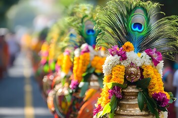 Vibrant Devotional Procession with Decorative Kavadi and Peacock Feathers