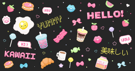 Collection of pixel art cute stickers vector design. 8 bit 90s game style japanese vector graphic labels, emojis and prints. Set of kawaii stuff