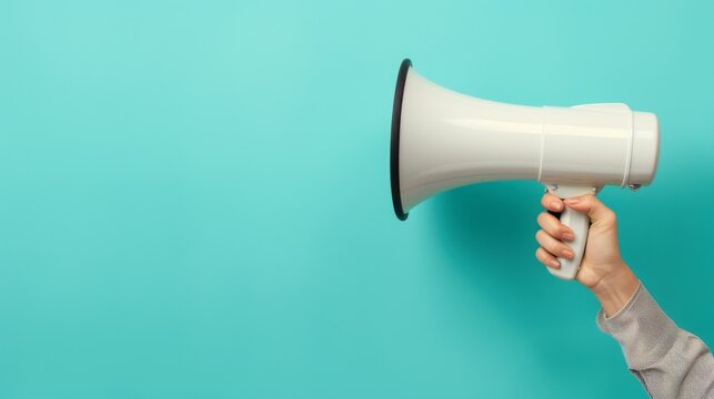 white megaphone held in hand stands out vividly against a plain turquoise background, symbolizing communication and attention