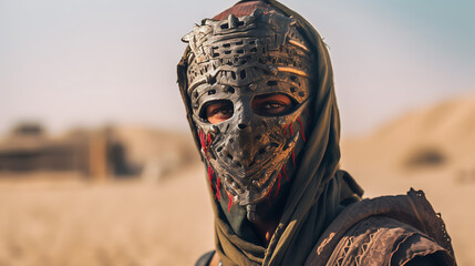 Egyptian Bedouin in a mask on the background of the desert in a post-apocalyptic scene close-up . Ai Generative
