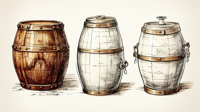 Wood barrels for alcoholic beverages. Oak kegs with wine or beer. Hand drawn engraving style illustration