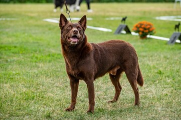 Summer portrait of smart chocolate brown and sable tan working Australian kelpie dog. Attractive smiling national Australian breed Australian sheep dog outside with yellow eyes and green background