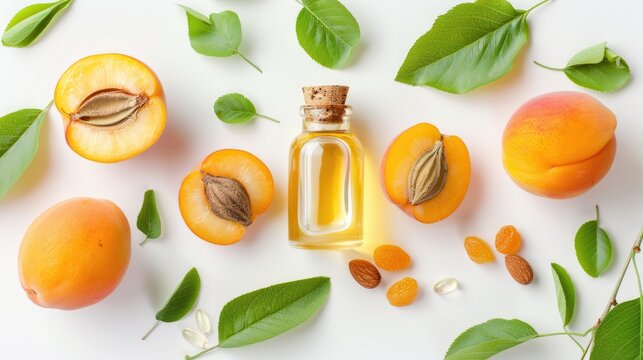 Apricot kernel oil with a fruity scent displayed on a white background from above