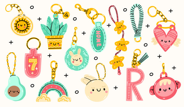 Set of various different Keychains. Keyholders and keyrings collection. Modern keys with pendants. Hand drawn Kawaii Vector illustration. Home rental, property, real estate concept.